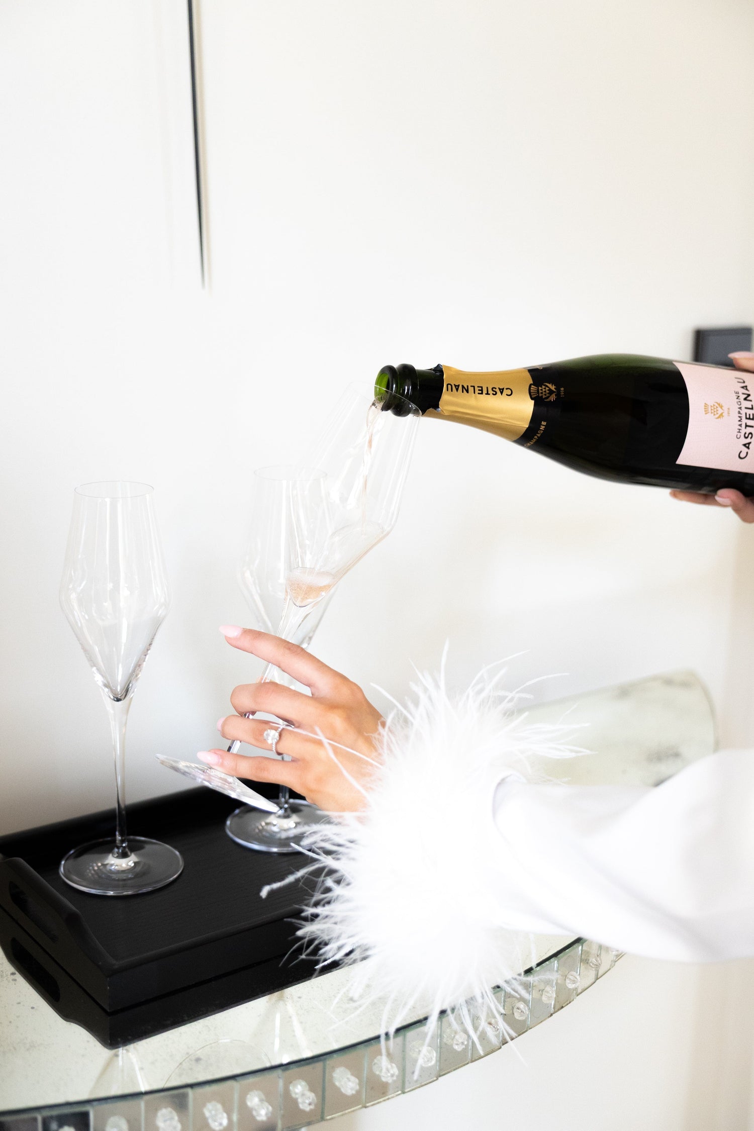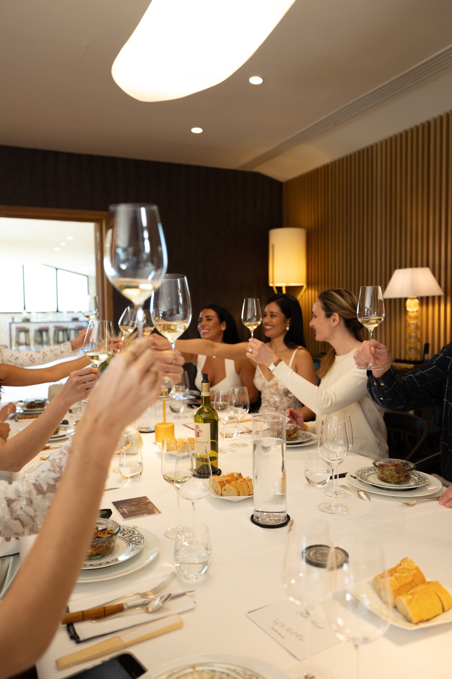 Après un vol matinal de Londres à Bordeaux, l'expérience a commencé dès l'arrivée de nos invitées au Château. Les filles se sont installées et ont enfilé leur première tenue MERABI, le pyjama blanc DARCIE, stylisé avec des talons de leur choix. Leurs chambres avaient été préparées avant leur arrivée, avec leurs tenues pour le voyage, des trousses de beauté brodées remplies d'essentiels pour la mariée de Space NK, des mots de bienvenue et des touches personnalisées. Une fois prêtes, elles ont été accueillies avec une coupe de champagne et un déjeuner familial dans la salle à manger.