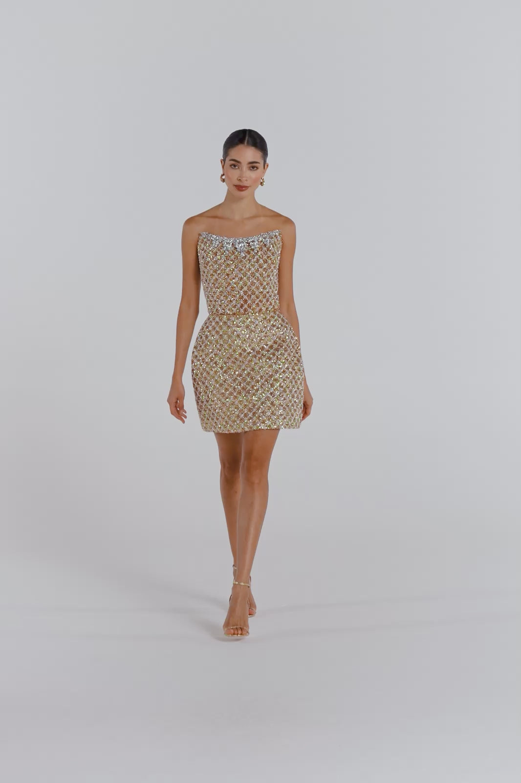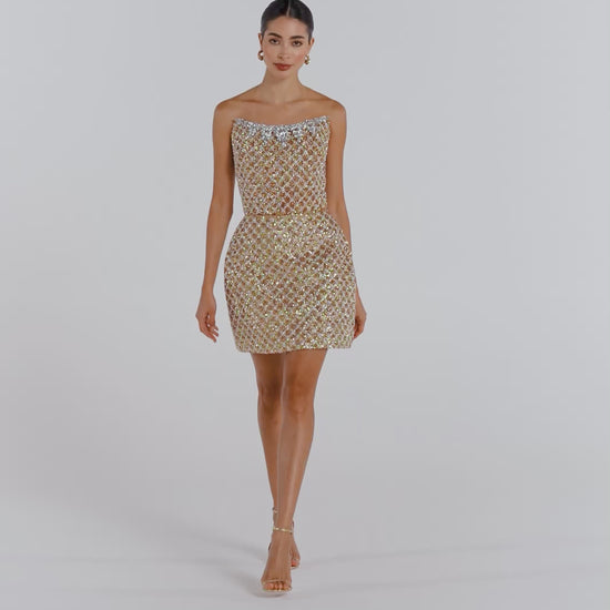 La robe dorée SAVANNAH est confectionnée dans un somptueux tissu à sequins dorés, sublimé par un empiècement contrastant argenté orné de perles. Elle présente un corsage structuré avec baleines à l’avant, à l’arrière et sur les côtés, associé à notre jupe mini tulipe signature. Elle est complétée par une encolure bandeau structurée et incurvée, rehaussée d’un galon de bijoux argentés en forme de gouttes, et se termine par une fermeture éclair dissimulée au dos.